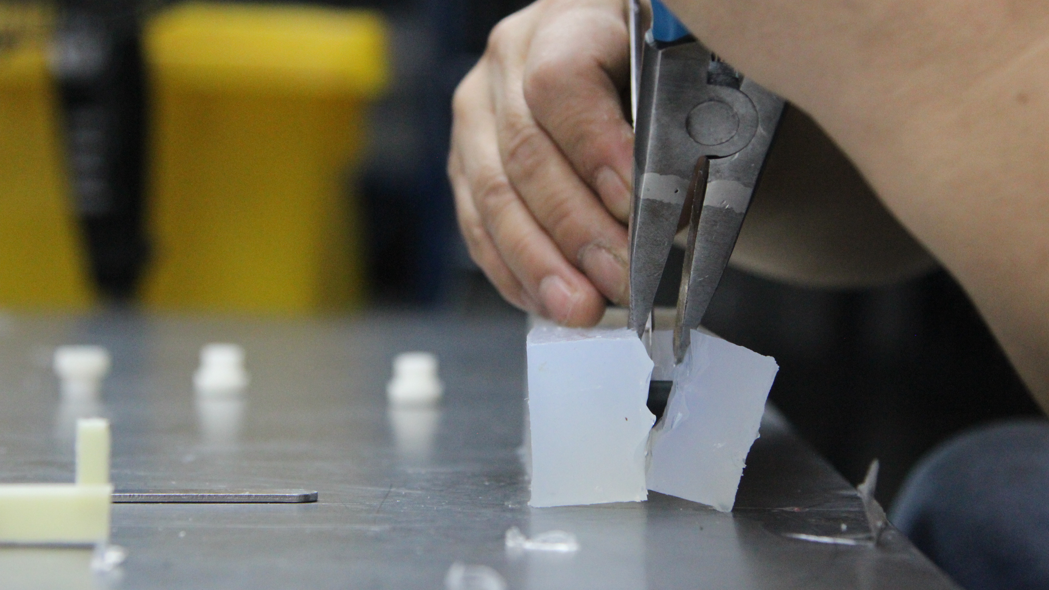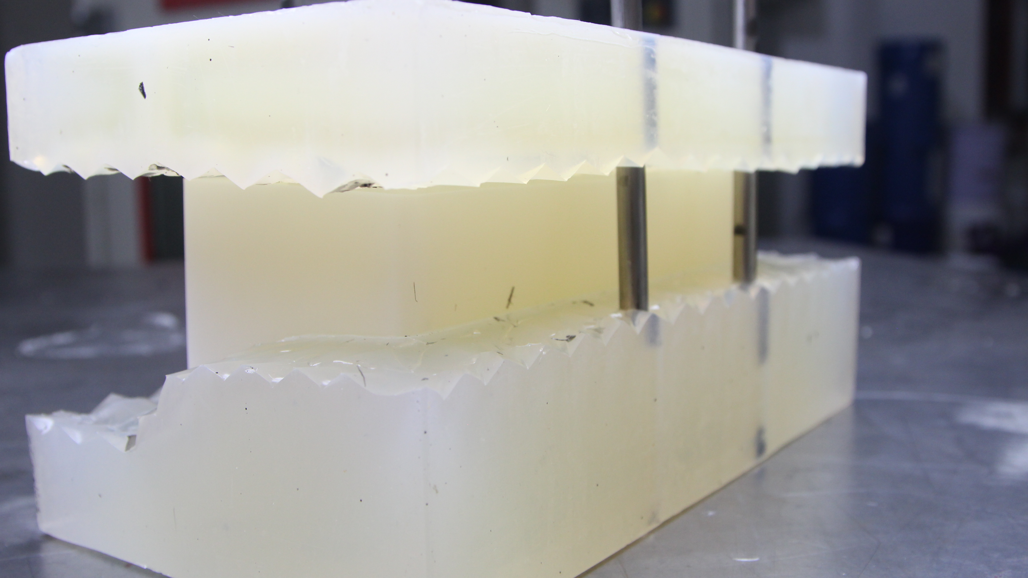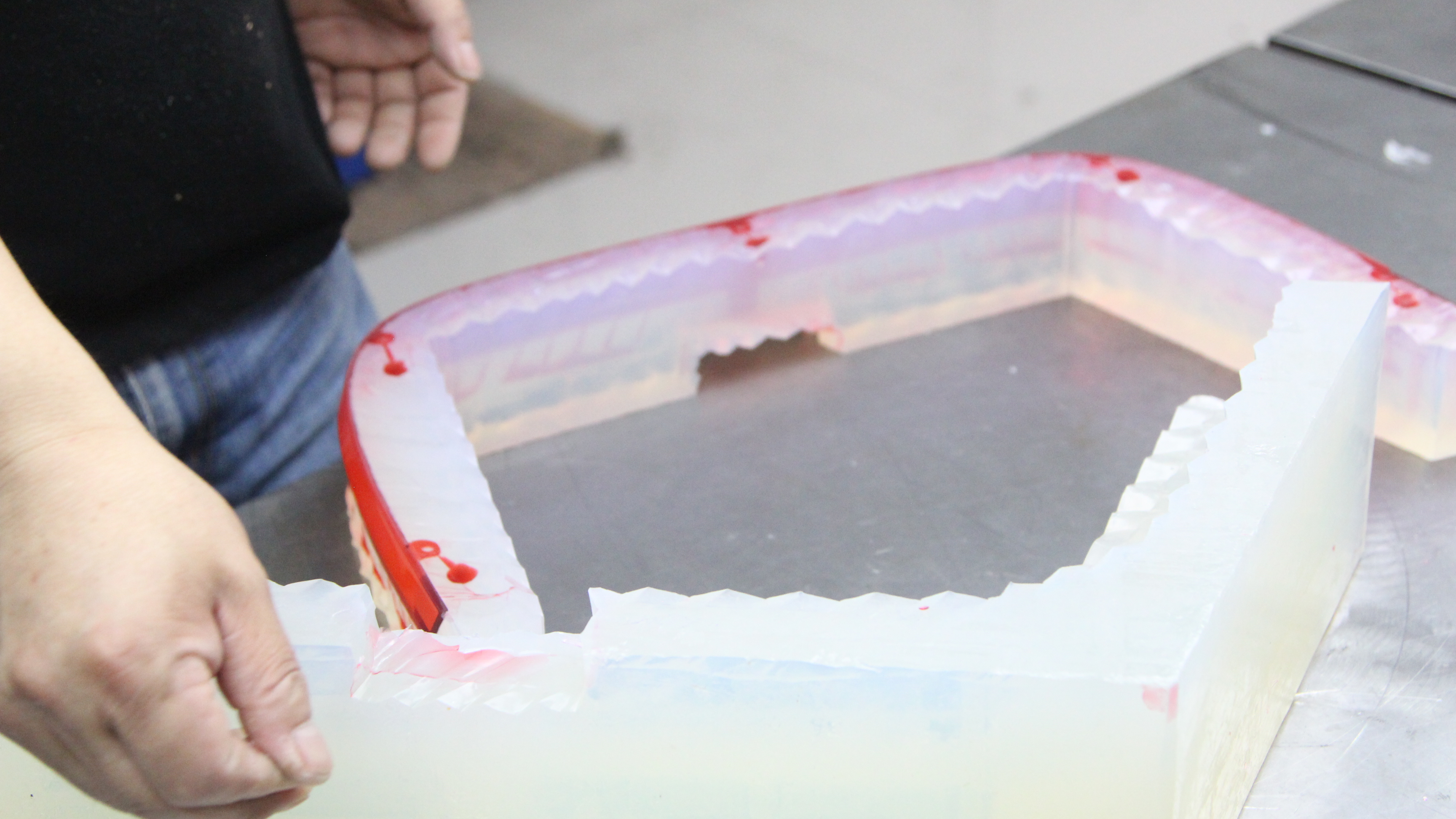 - Nach dem vollständigen Aushärten den Formkasten entfernen und die Silikonform vorsichtig mit einer Klinge entlang der vorgesehenen Trennlinie durchschneiden, um den Prototyp zu erhalten. An diesem Punkt ist eine Negativ-Silikonform fertig.